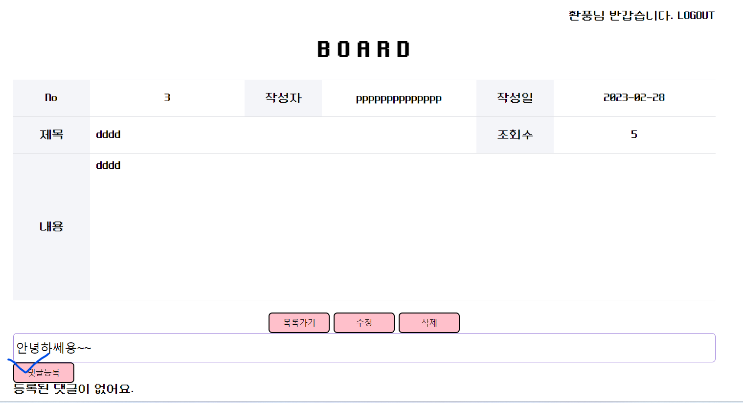 이곳으로 돌아와 댓글 목록조회 코드를 짜줄 수 있는데, 아직 댓글을 쓰기만 하고 화면에 뿌려주지 못했다.