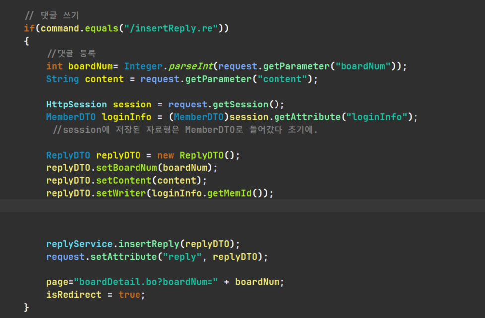 ReplyDTO 객채를 생성한 후 세터를 이용해 각각 뿌려줄 데이터를 저장하고, loginInfo에 담긴 MemId도 넣어준다.